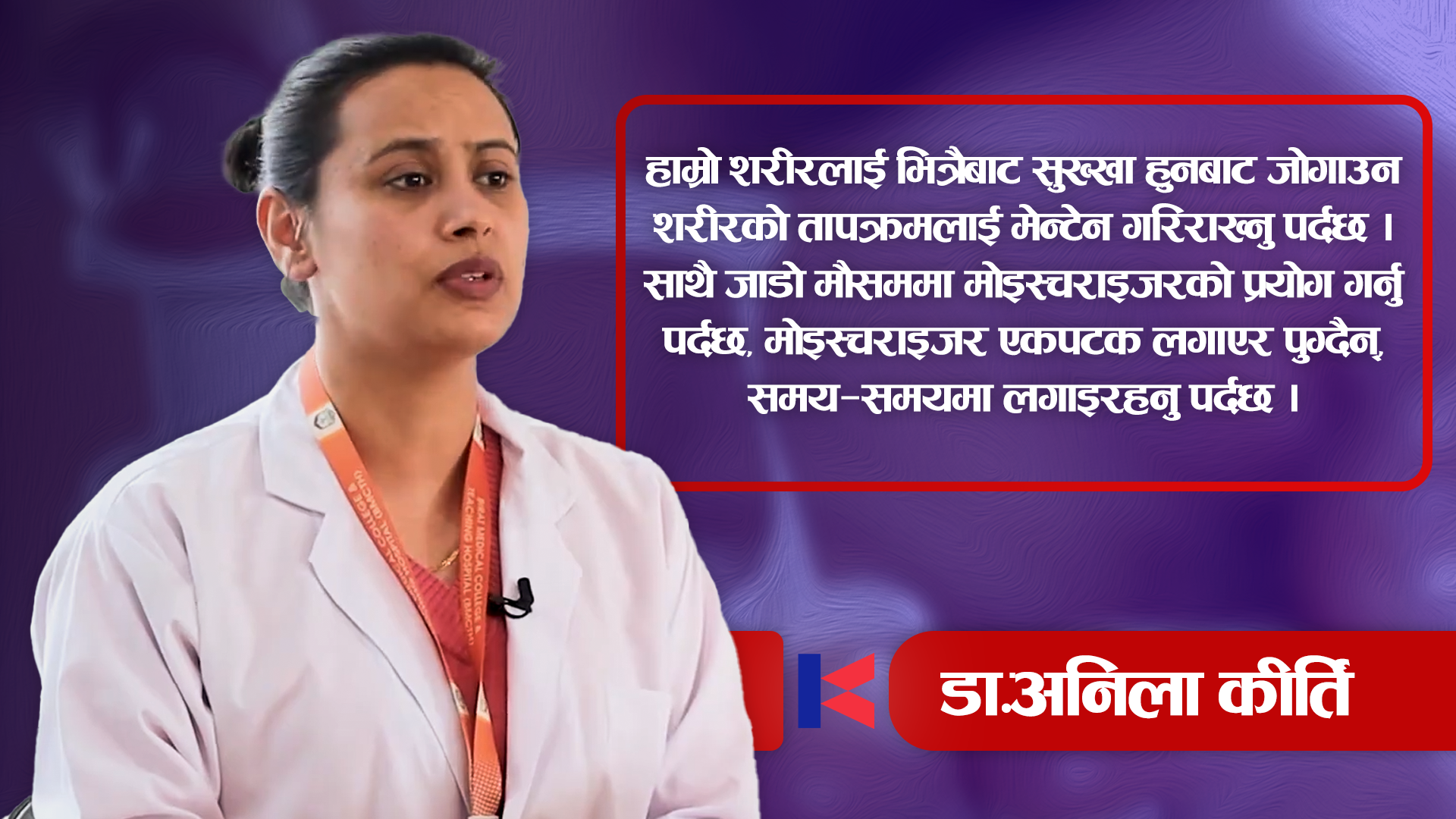 छालाको समस्याबाट बच्न शरीरलाई चाहिने भनेको भिटामिन ए, सी र ई मुख्य हुन् । छालालाई हेरचाह गर्न दैनिक फलफूलहरू खाने, हाम्रो शरीरलाई भित्रैबाट सुख्खा हुनबाट जोगाउन शरीरको तापक्रमलाई मेन्टेन गरिराख्नु पर्ने उनले बताइन् ।