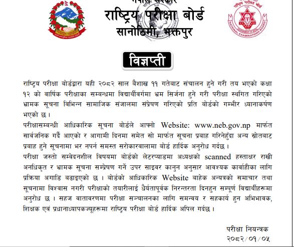 राष्ट्रिय परीक्षा बोर्डले कक्षा(१२ को परीक्षा हालसम्म स्थगित नगरिएको जनाएको छ। सामाजिक सञ्जालमा कक्षा(१२ को परीक्षा स्थगित भएको भनी पत्रसहित प्रचारप्रसार हुन थालेपछि बोर्डले विज्ञप्ति जारी गर्दै स्थगित नभएको जानकारी दिएको हो।बोर्डले बोर्डको लेटरप्याडमा अध्यक्षको स्क्यान गरी हस्ताक्षर राखी अनधिकृत र भ्रामक सूचना सम्प्रेषण गर्ने उपर साइबर कानुनअनुसार आवश्यक कारबाहीका लागि प्रक्रिया अगाडि बढाएको जनाएको छ।‘२०८२ साल वैशाख ११ गतेबाट संचालन हुने गरी तय भएको कक्षा १२ को वार्षिक परीक्षाका सम्बन्धमा विद्यार्थी वर्गमा भ्रम सिर्जना हुने गरी परीक्षा स्थगित गरिएको भ्रामक सूचना विभिन्न सामाजिक संजालमा सम्प्रेषण गरिएकोप्रति बोर्डको गम्भीर ध्यानाकर्षण भएको छ, बोर्डको आधिकारिक वेबसाइटबाहेक अन्यत्रको समाचार तथा सूचनामा विश्वास नगरी परीक्षाको तयारीलाई धैर्यतापूर्वक निरन्तरता दिन हुन सम्पूर्ण विद्यार्थीहरूमा अनुरोध छ, सहज वातावरणमा परीक्षा सञ्चालनका लागि समन्वय र सहकार्य हुन अभिभावक, शिक्षक एवं प्रधानाध्यापकज्यूहरूमा राष्ट्रिय परीक्षा बोर्ड हार्दिक अपिल गर्दछ,’ विज्ञप्तिमा उल्लेख छ।