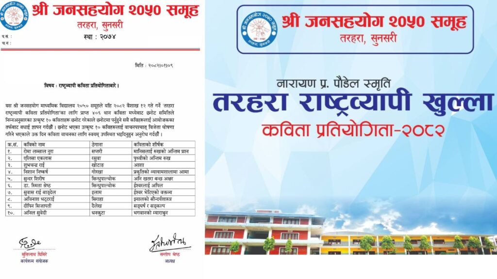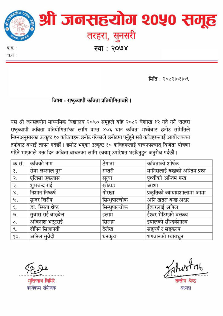 इटहरी २० तरहरामा यही शुक्रवार ९वैशाख १२० गते हुने राष्ट्रिय कविता प्रतियोगिताका लागि १० वटा कविता छनोट भएका छन् ।‘स्व। कवि नारायण पौडेल स्मृति तरहरा राष्ट्रव्यापी खुल्ला कविता प्रतियोगिता–२०८२’ का लागि प्राप्त भएका ४०६ कवितामध्ये १० वटा कविता छनोट गरिएको हो । निर्णायक समितिले मूल्याङ्कन गरी आज ९मङ्गलबार० छनोट भएका कविता सार्वजनिक गरेको हो ।सार्वजनिक भएका कविहरूमा सप्तरीकी रोमा लम्साल नुराको ‘मानिसलाई रूखको अन्तिम प्रश्न,’ रसुवाकी एलिसा एकलासको ‘पृथ्वीको अन्तिम रूख,’ खोटाङका शुभचन्द्र राईको ‘आशा,’ गोरखाका निशान निष्कर्षको ‘प्रकृतिको व्यायामशालामा आमा,’ सिन्धुपाल्चोकका सुन्दर शिरीषको ‘अनि खतरा बन्छ अक्षर,’ सिन्धुपाल्चोककी डा। स्मिता श्रेष्ठको ‘ईश्वरलाई अपिल,’ इलामका सुवास राई बाङ्देलको ‘ईश्वर भेटिएको वक्तव्य,’ सिराहाका अविनाश भट्टराईको ‘झ्यालको सौन्दर्यशास्त्र,’ दैलेखका दीपिन सिजापतीको ‘सङ्घर्ष र सङ्कल्प,’ र धनकुटाका अनिल सुवेदीको ‘भगवानको म्याराथुन’ शीर्षकको कविता अन्तिम १० छनोटमा परेको हो ।आयोजक समितिका संयोजक मुक्तिनाथ घिमिरेका अनुसार श्री जनसहयोग माध्यमिक विद्यालयमा २०५० सालमा एसएलसी दिएका समूहले आयोजना गर्न लागेको प्रतियोगितामा प्रथम हुने कविलाई नगद ५१ हजार एक सयसहित पुरस्कृत गरिनेछ ।यसैगरी द्वितीय, तृतीय र प्रोत्साहन पुरस्कार ९दुई जनालाई० क्रमशः ४१ हजार एक सय, ३१ हजार एक सय र ११ हजार एक सय प्रदान गरिनेछ । छनोट भएकामध्ये अन्य पाँच जनालाई नगद पाँच हजार एक सयसहित पुरस्कृत गरिने उनले जनाए ।