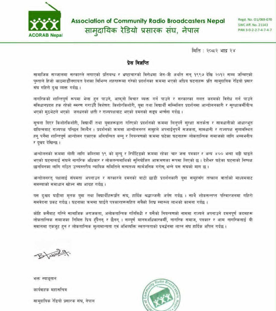 सामाजिक सञ्जालमा सरकारले लगाएको प्रतिबन्ध र भ्रष्टाचारको विरोधमा जेन–जी अर्थात् सन् १९९७ देखि २०१२ सम्म जन्मिएको पुस्ताले काठमाडौँलगायत देशका विभिन्न शहरहरूमा सोमवार ९भाद्र २३० गरेको प्रदर्शनका क्रममा भएको अप्रिय घटनाप्रति सामुदायिक रेडियो प्रसारक संघ, नेपालले गहिरो दुःख व्यक्त गरेको छ।