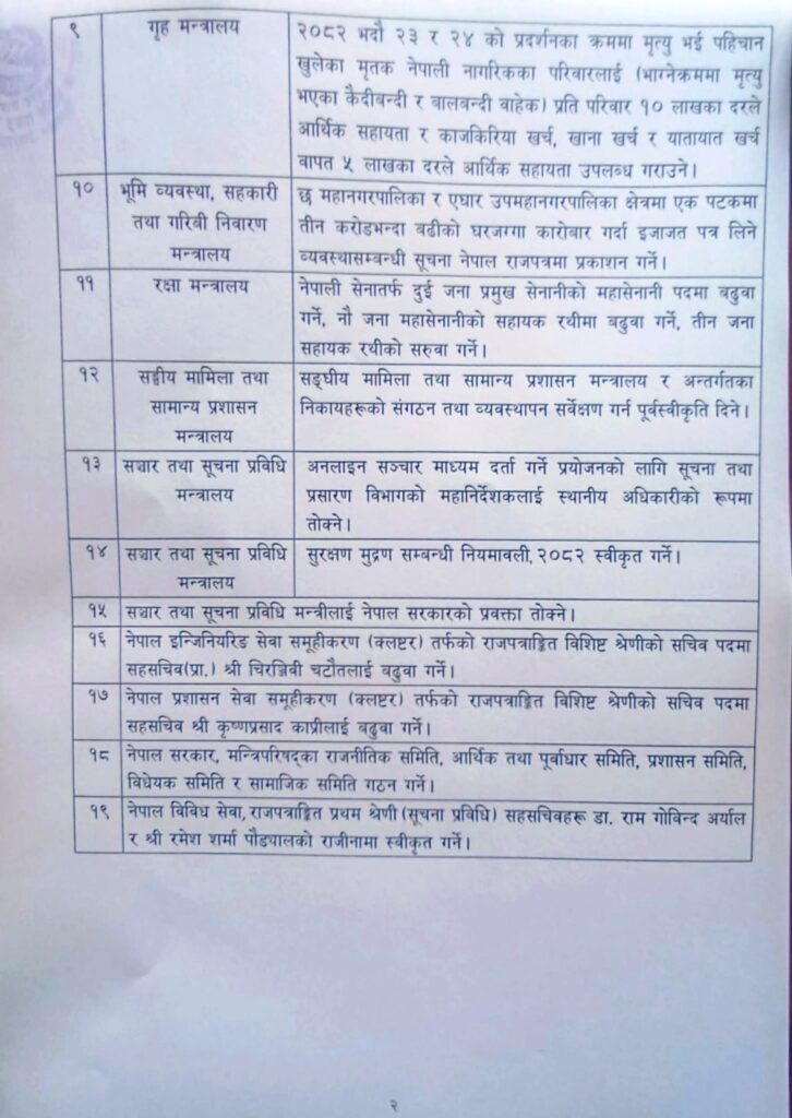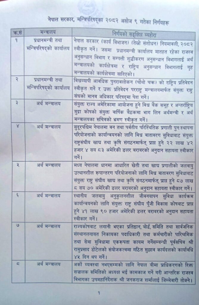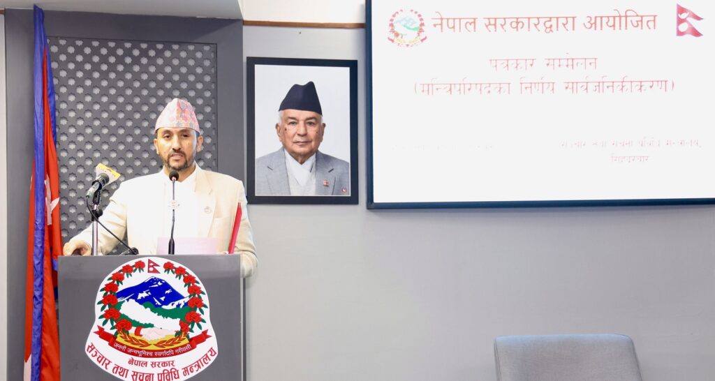 बिहीबार बसेको मन्त्रिपरिषद् बैठकका निर्णयहरु सार्वजनिक भएका छन् । आज मनत्रालयमै आयोजित पत्रकार सम्मेलनमा सरकारका प्रवक्तासमेत रहेका सञ्चार तथा सूचना प्रविधिमन्त्री जगदिश खरेलले सार्वजनिक गरेका हुन् ।